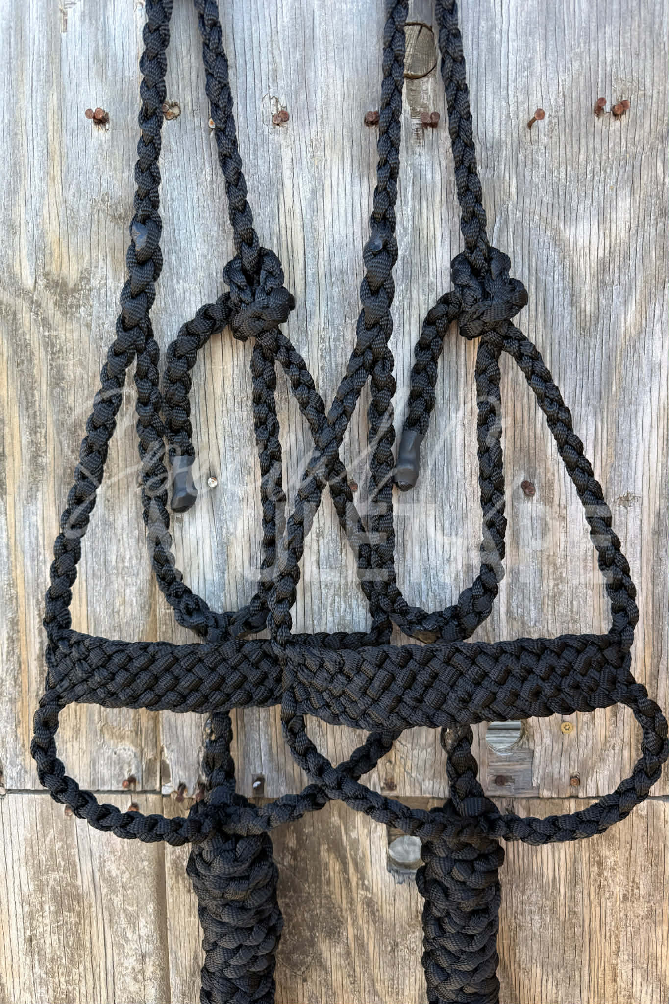 Traditional style muletape halter with a flat braided, 2” wide noseband. Attached 8’ leads included with these.