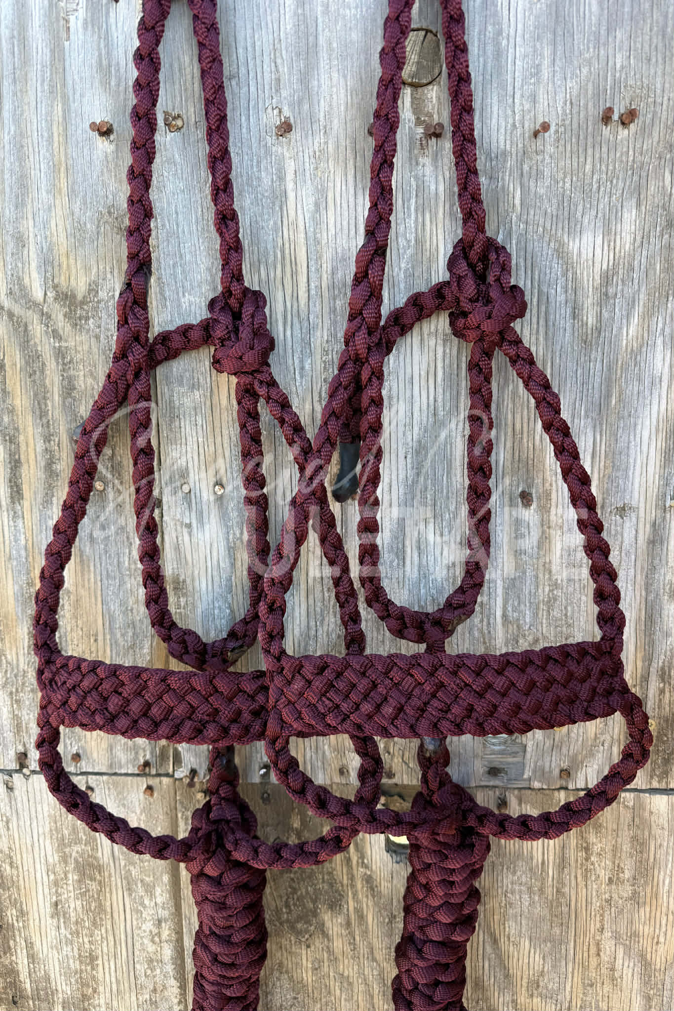 Traditional style muletape halter with a flat braided, 2” wide noseband. Attached 8’ leads included with these.