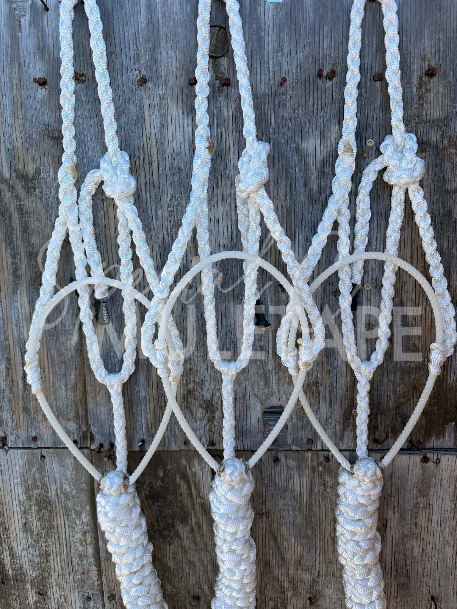 The ever so popular Lariat Style muletape halter. Hand braided onto a hand tied team rope noseband. Standard Horse size. Attached 8’ lead rope is included.