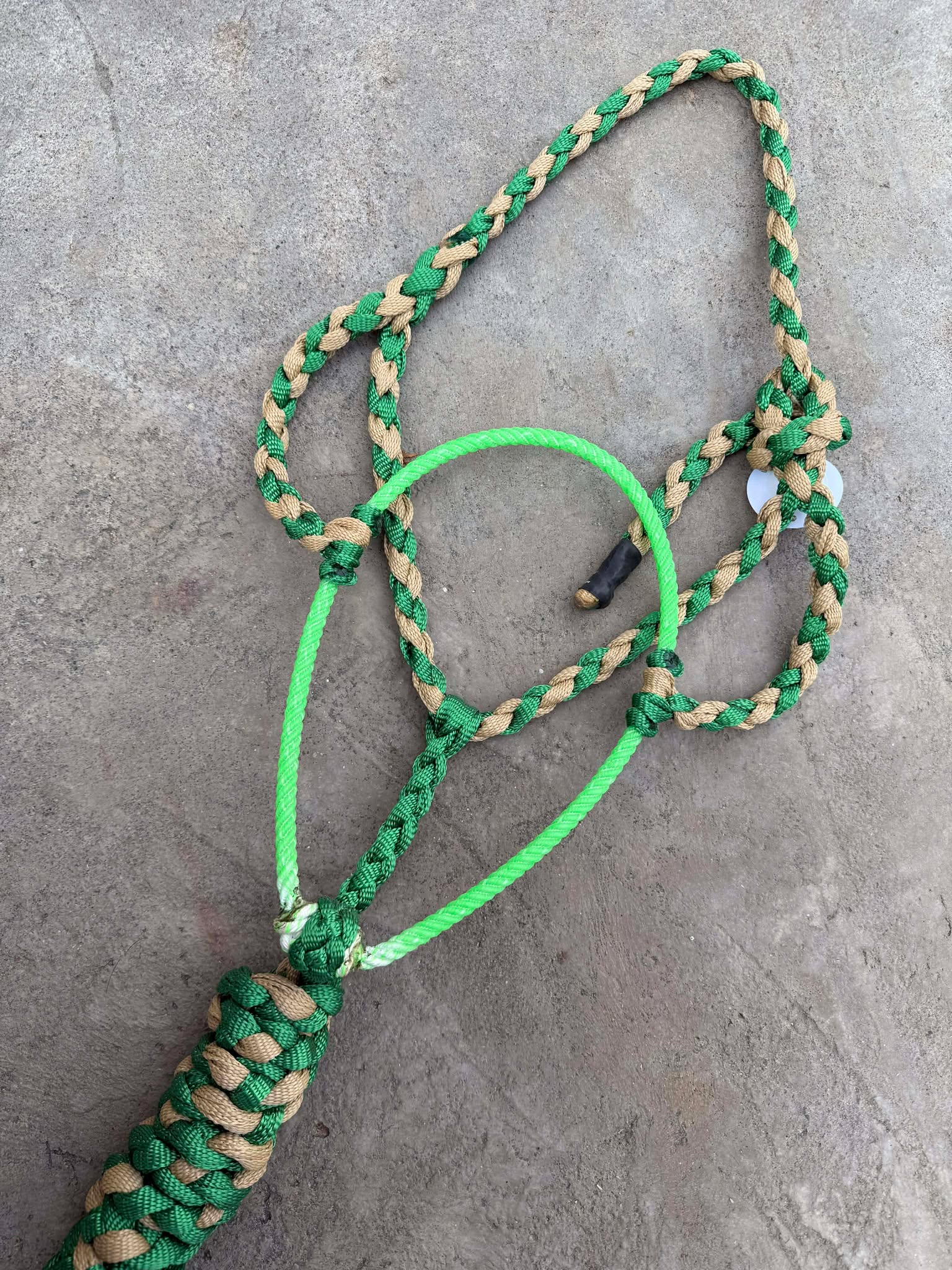 The ever so popular Lariat Style muletape halter. Hand braided onto a hand tied team rope noseband. Standard Horse size. Attached 8β lead rope is included.