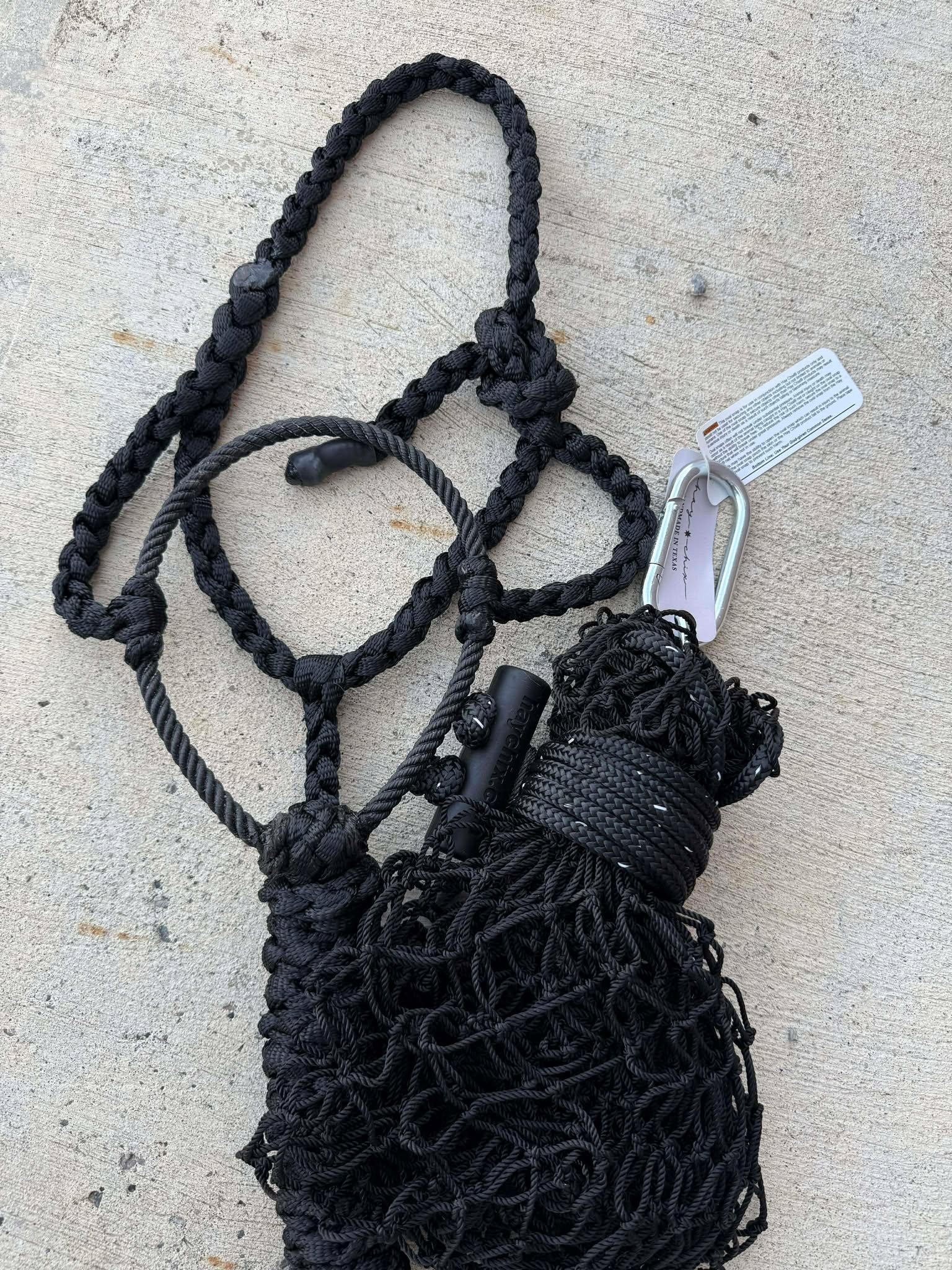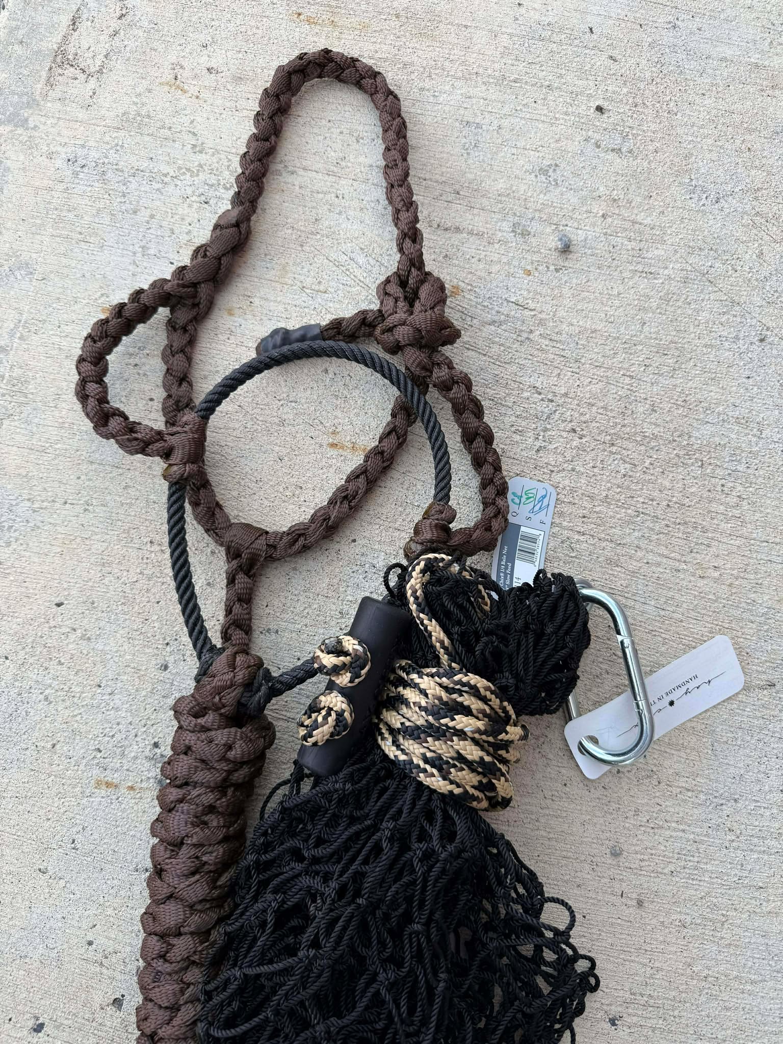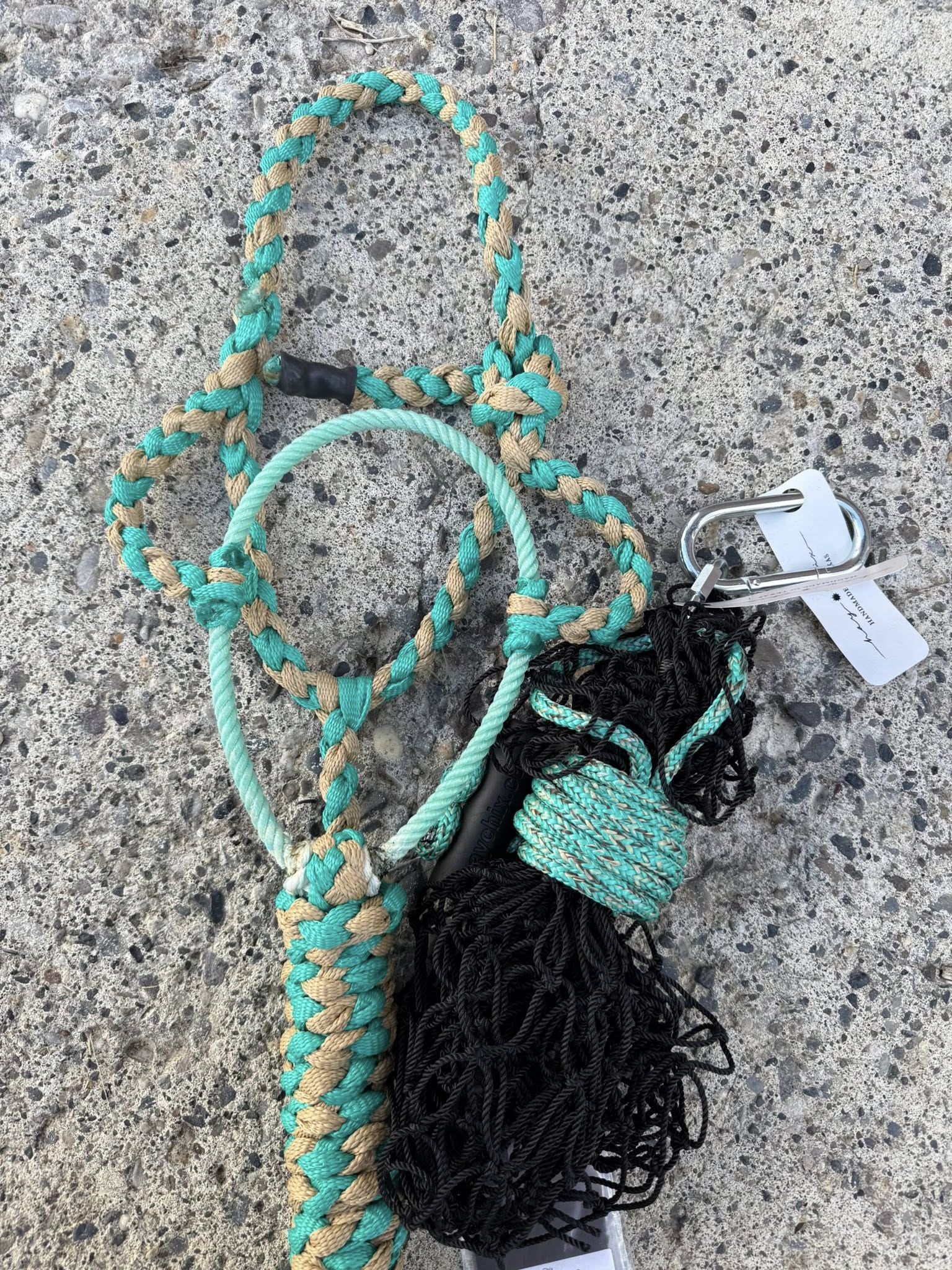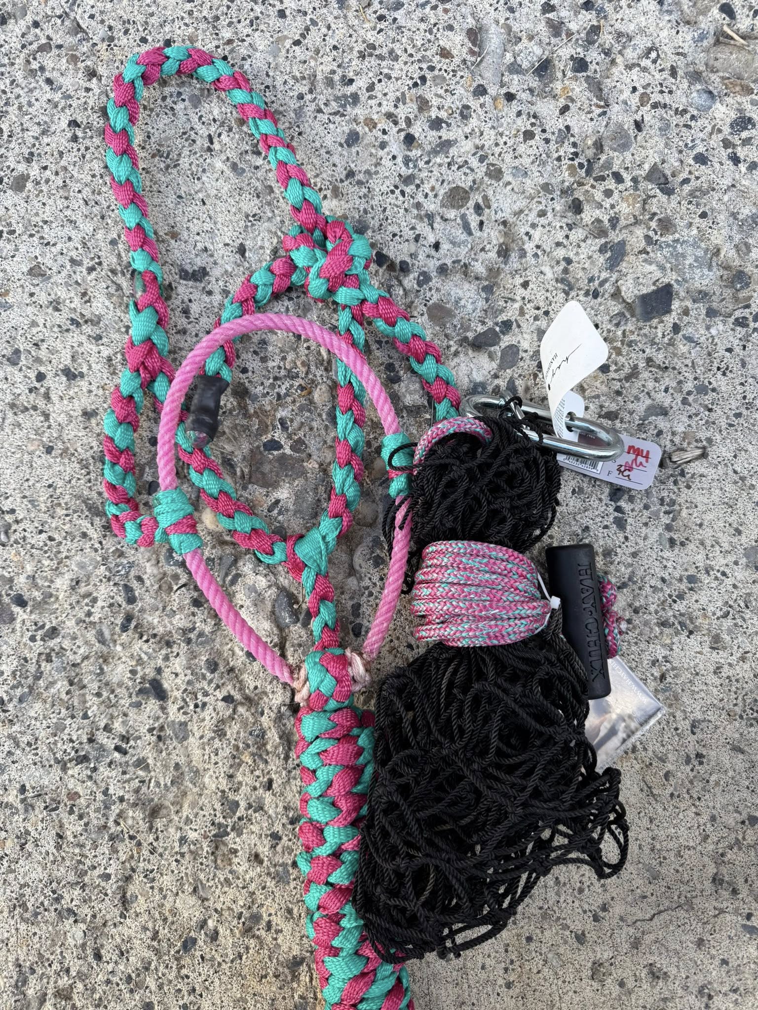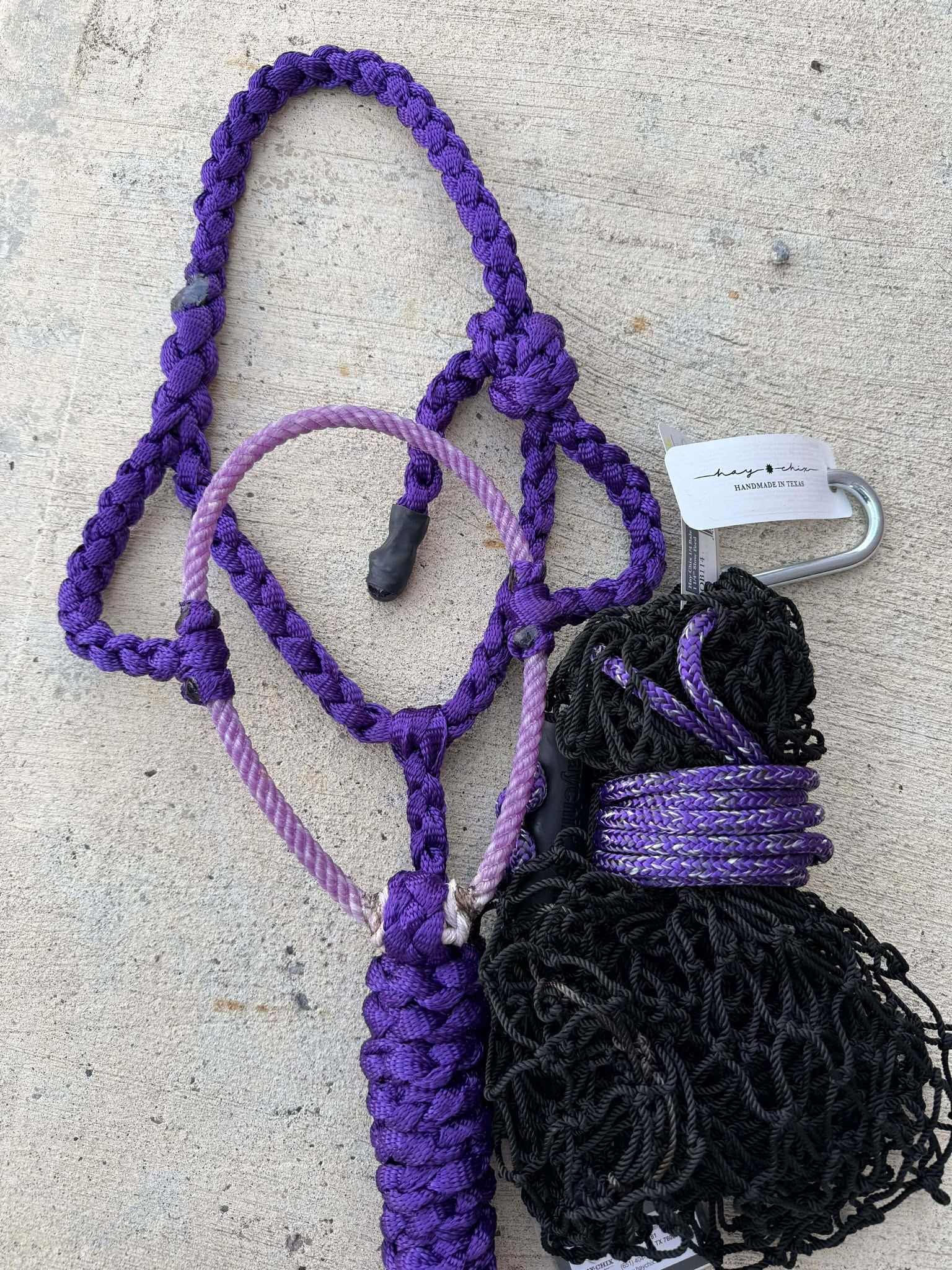 Our ever so popular Lariat style halter in MINI Size! These are paired with Hay Chix Quarter Bale nets with 1-3/4" holes. Halters have 8' attached leads on them.Β