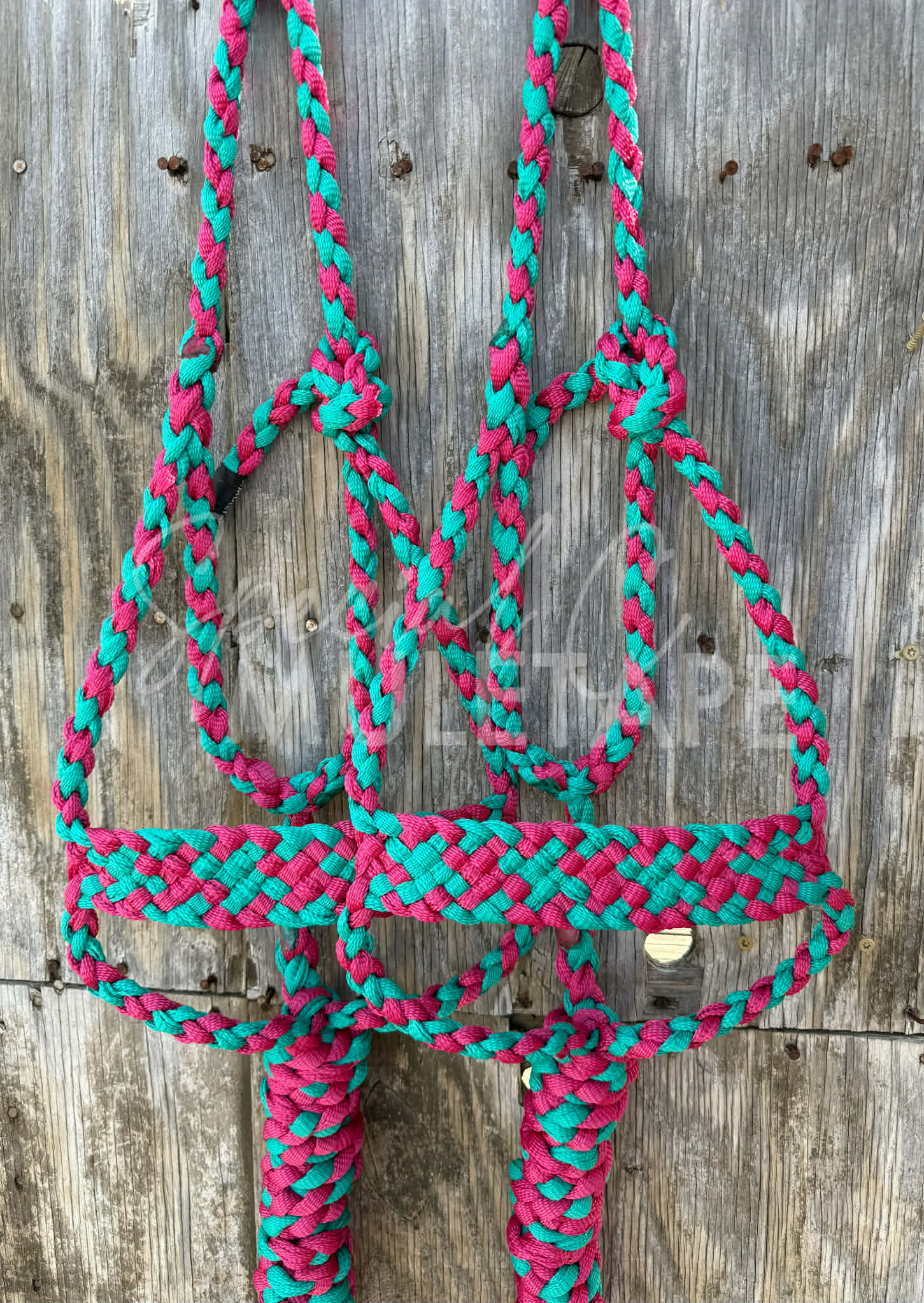 Traditional style muletape halter with a flat braided, 2” wide noseband. Attached 8’ leads included with these.
